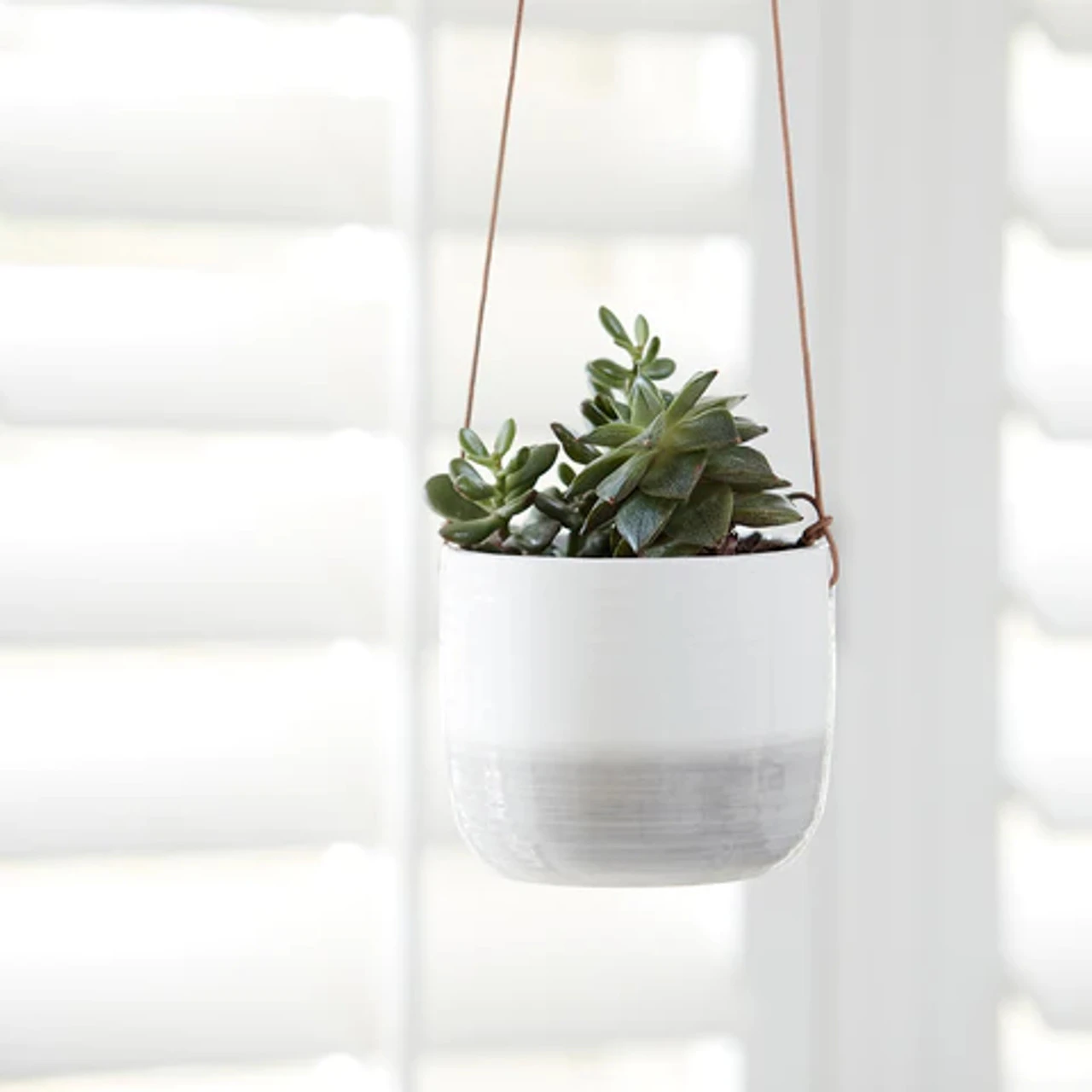 Displays of hanging plants are super-stylish and this new pot makes the trend very accessible. Tactile, subtly ridged design, as if straight from the potter’s wheel. Made from stoneware, waterproof and with a stylish and strong, leather hanging cord.
